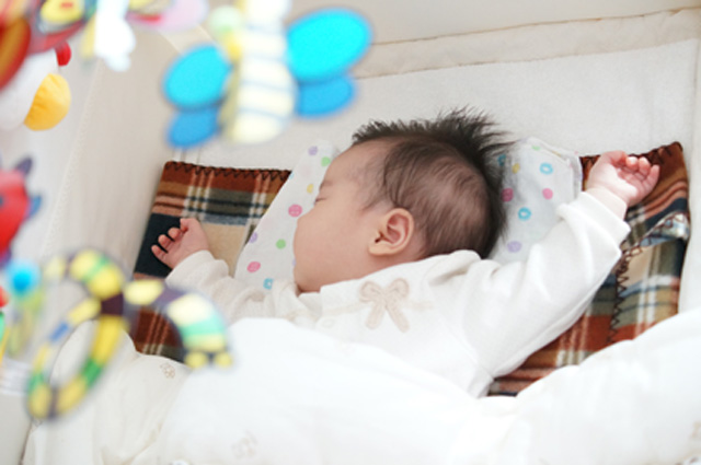 (한) 갓난아이가 두 팔을 머리 위로 벌리고 자는 잠.